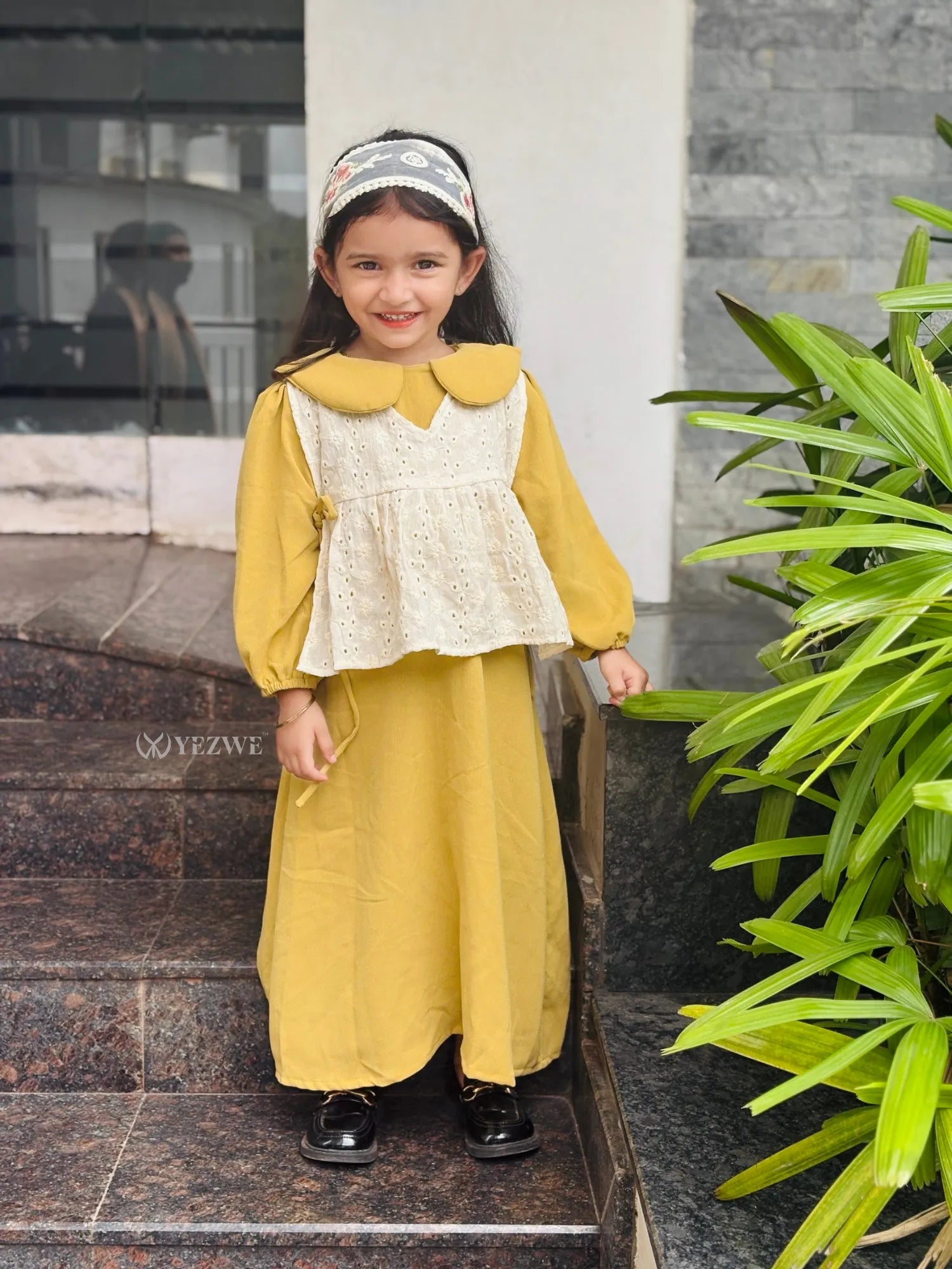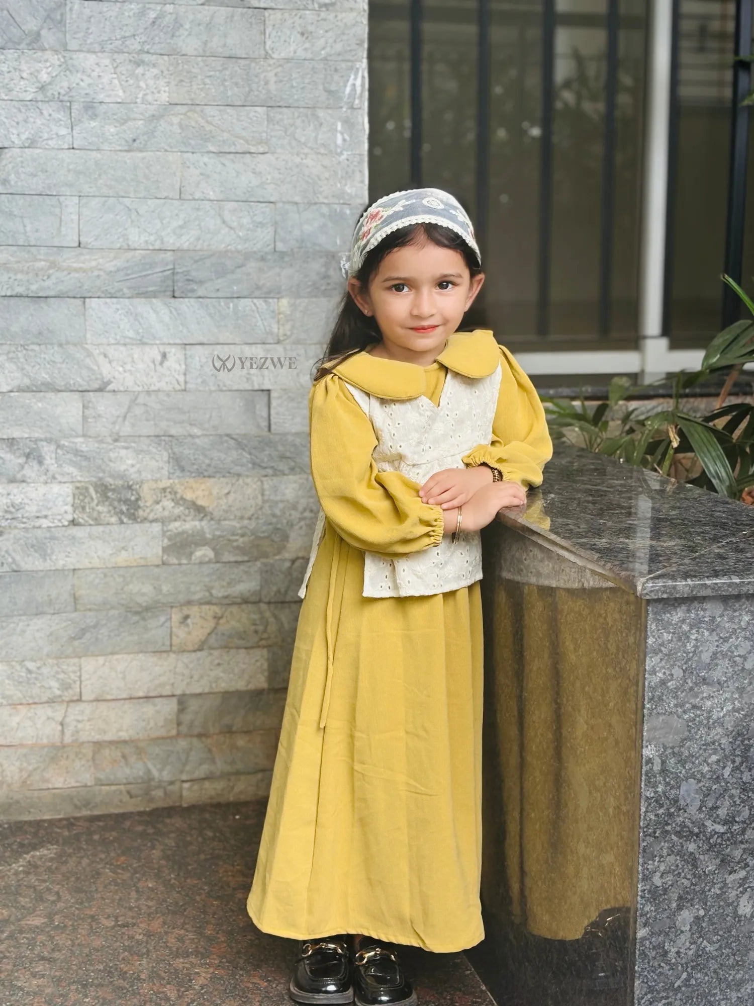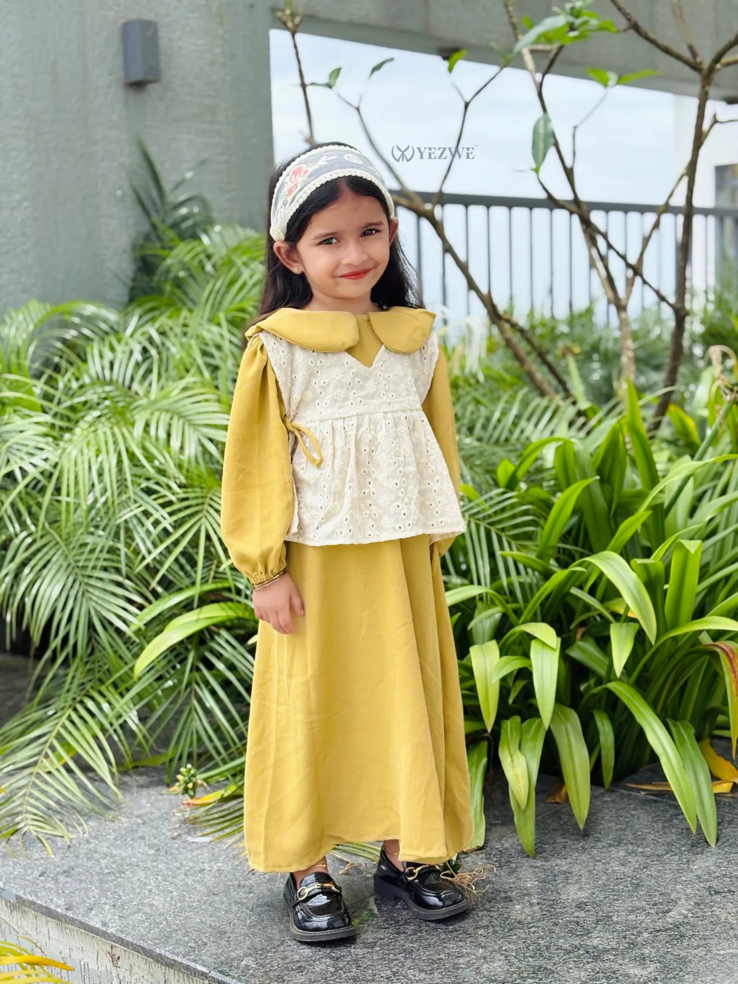 Add a vintage-inspired charm to your little one’s wardrobe with Yezwe’s Miniature Golden Grace Maxi Dress. This graceful fusion of western flair and traditional elegance features a soft mustard yellow Cey fabric base, complemented by a detachable ivory Hakoba shrug with an exaggerated collar and peplum silhouette. Perfect for both casual outings and special occasions, this coquette dress is designed for junior girls who appreciate modest style with a trendy twist. The lightweight fabric and versatile design make it comfortable and stylish for all-day wear.
