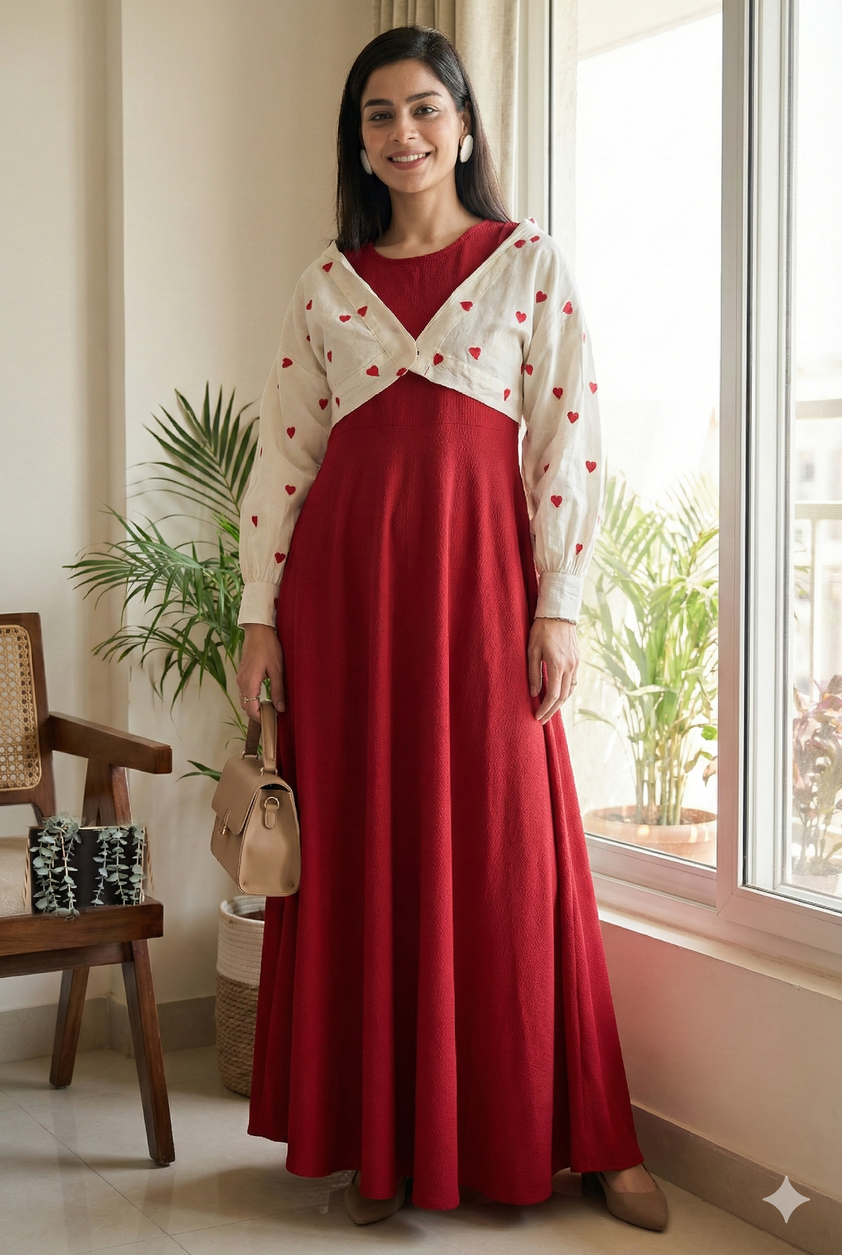 Elevate your style with the Yezwe Red Knitted Maxi Dress, a perfect blend of elegance and comfort. Designed with high-quality knitted kar fabric, this full-length maxi dress offers a graceful flow, making it ideal for both casual outings and special occasions. Paired with a charming heart-printed shrug, it adds a playful yet sophisticated touch to your wardrobe.