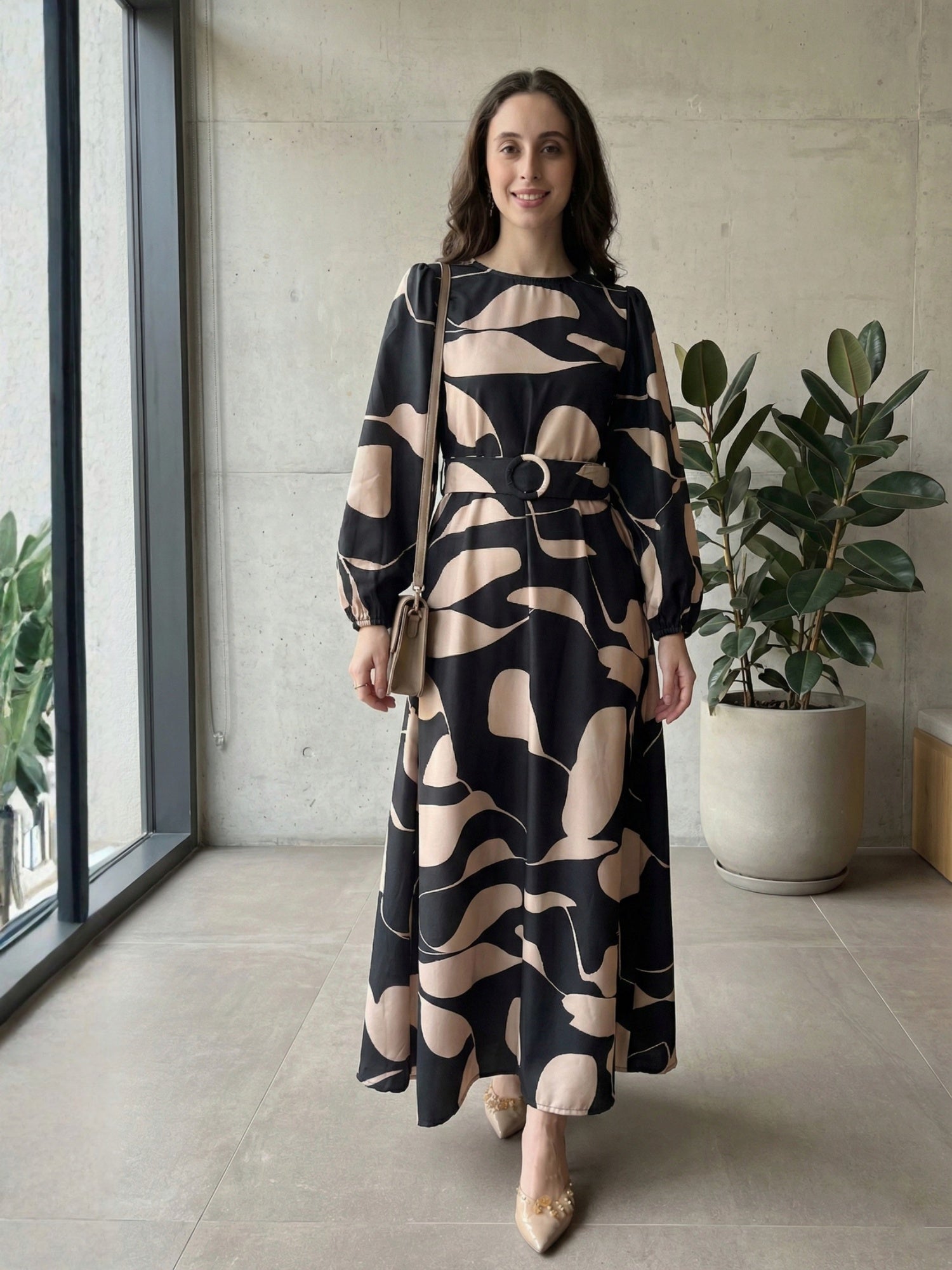 Elevate your wardrobe with the Yezwe Black and Nude Abstract Print Maxi Dress, a perfect blend of sophistication and elegance. Designed for modern women who embrace style with grace, this modest yet fashion-forward piece features a long-sleeve silhouette with puffed sleeves, a flattering belted waist, and a flowy A-line design. The premium imported fabric ensures a luxurious feel and comfort, making it an ideal choice for formal occasions, evening gatherings, or chic everyday wear.