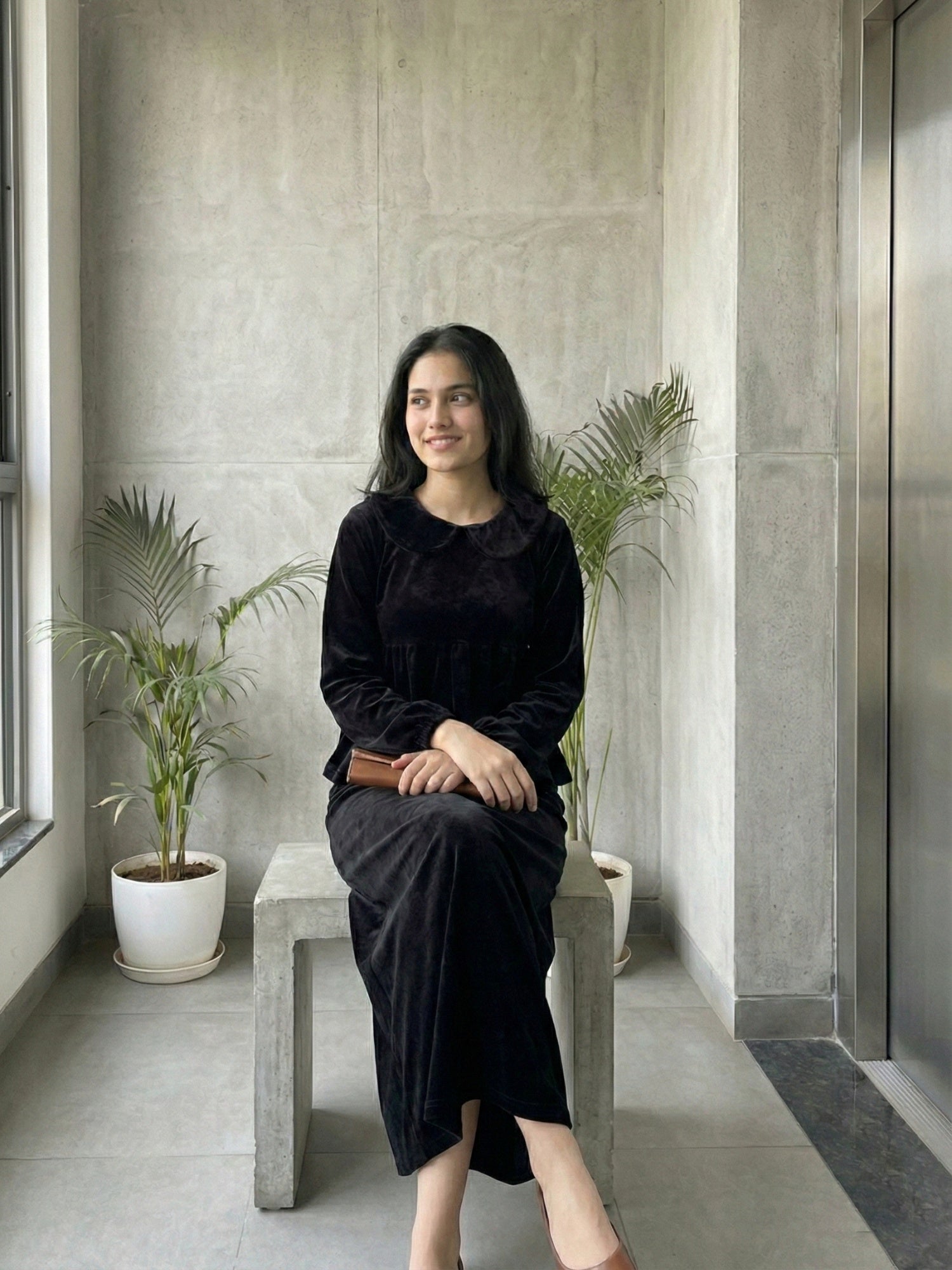 The velvet fabric feels smooth and gentle on the skin, offering a comfortable, non-cling fit that moves easily with the body. Its relaxed drape and breathable feel make it suitable for Indian weather while maintaining a luxurious, polished appearance.