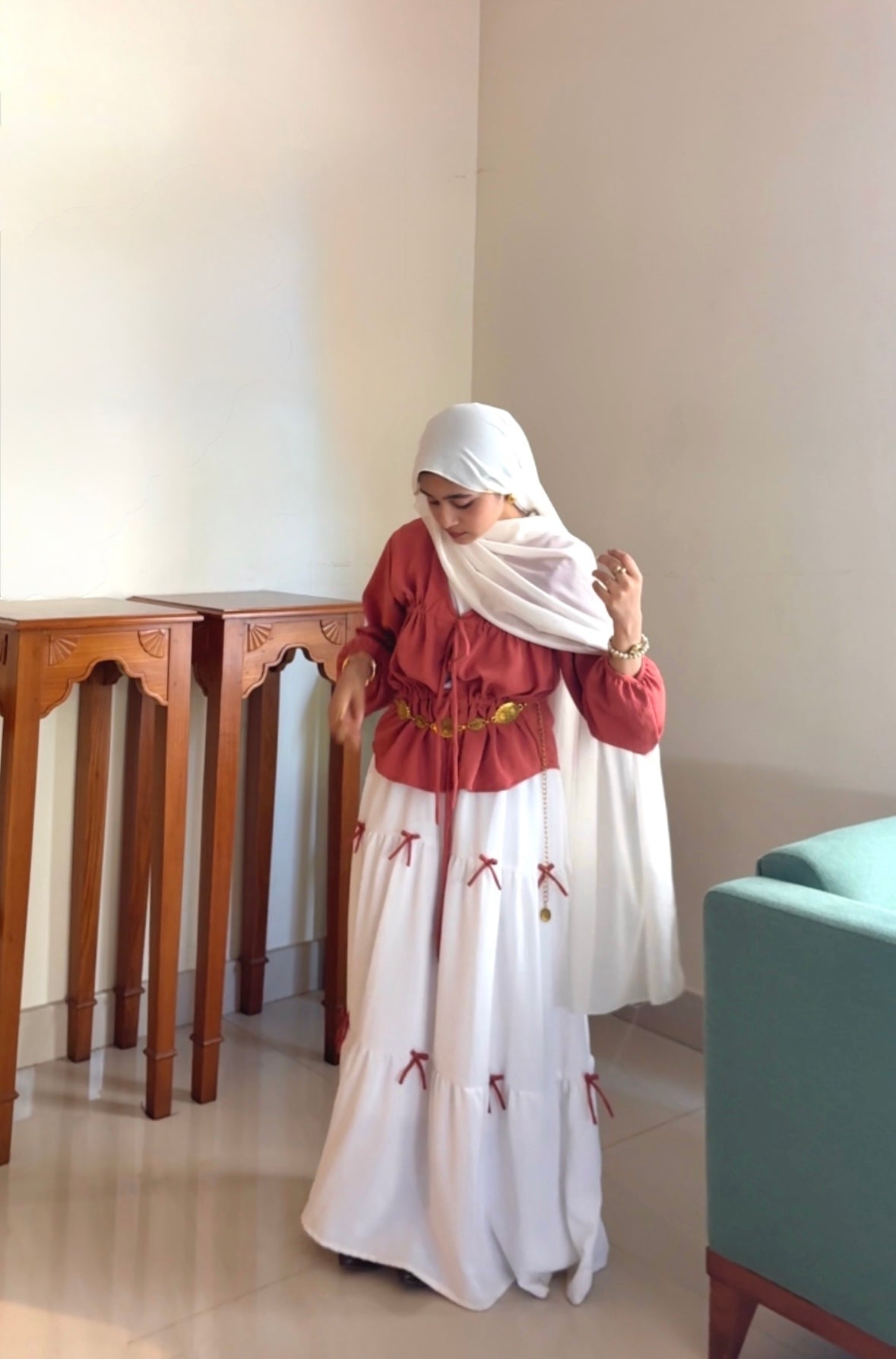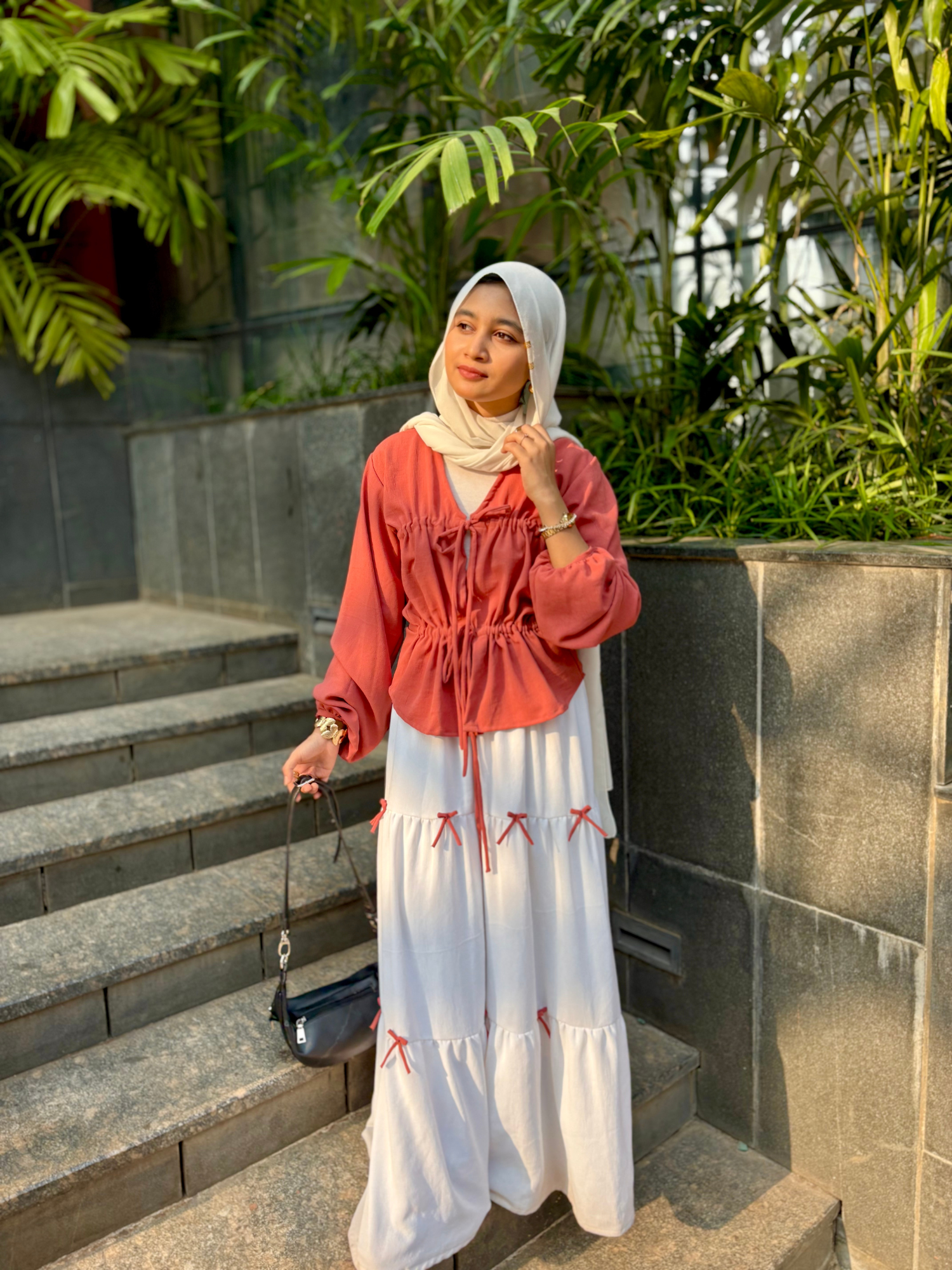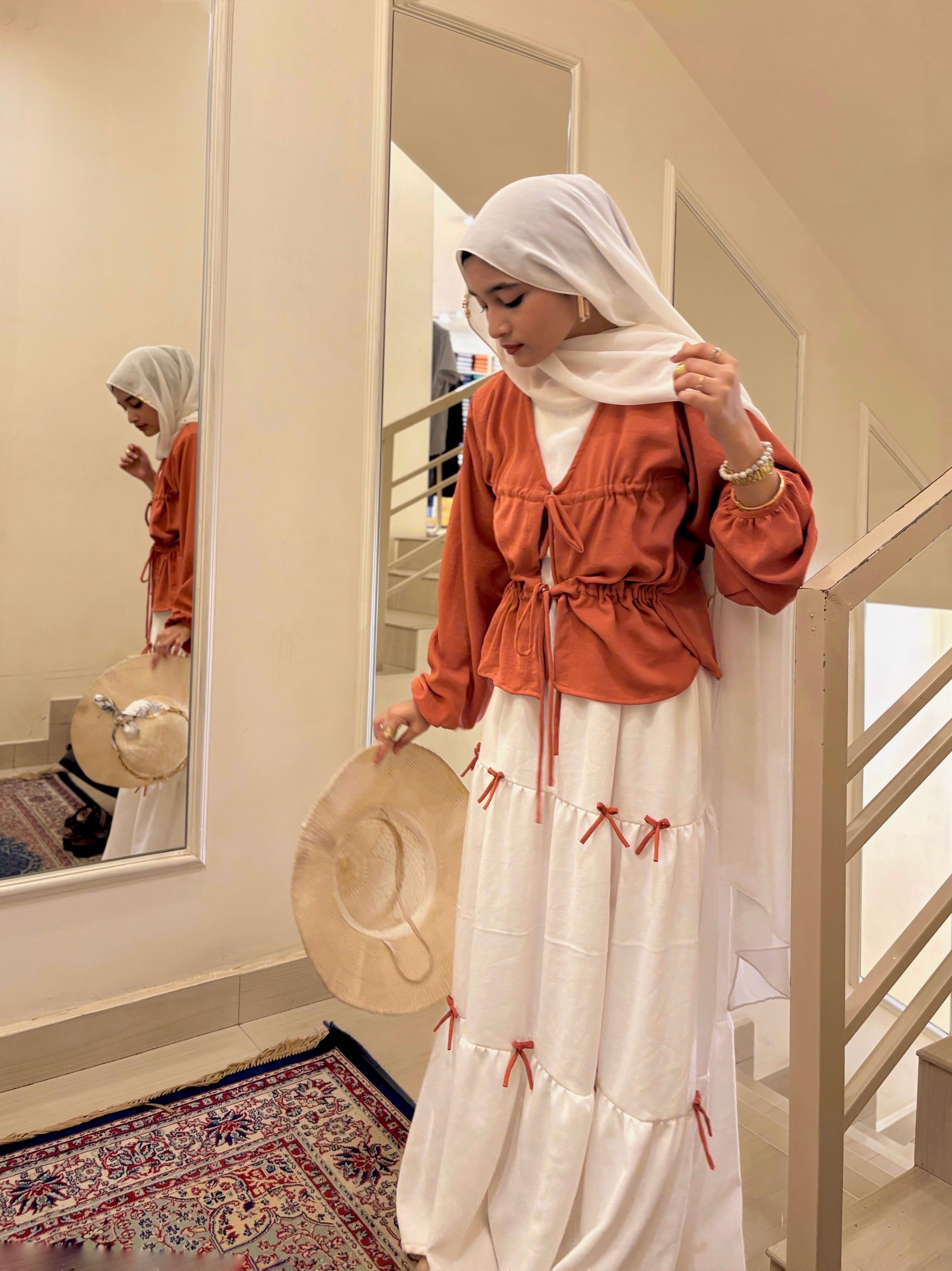 Embrace soft elegance with this rust drawstring top and white tiered maxi skirt set, designed for women who love modern modest wear with an effortless, feminine mood. The warm rust tone adds depth and richness, while the flowing white skirt brings balance, lightness, and everyday grace, making it ideal for Indian weather and versatile styling.