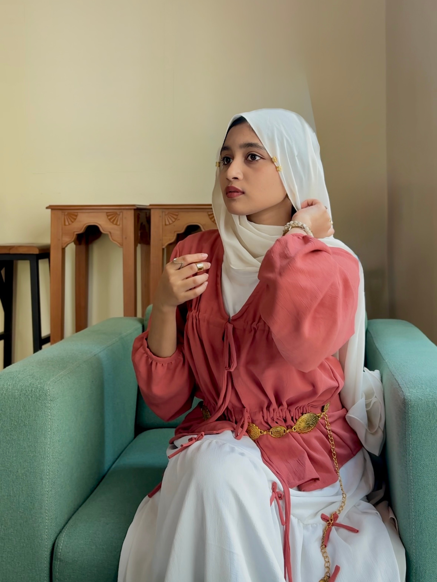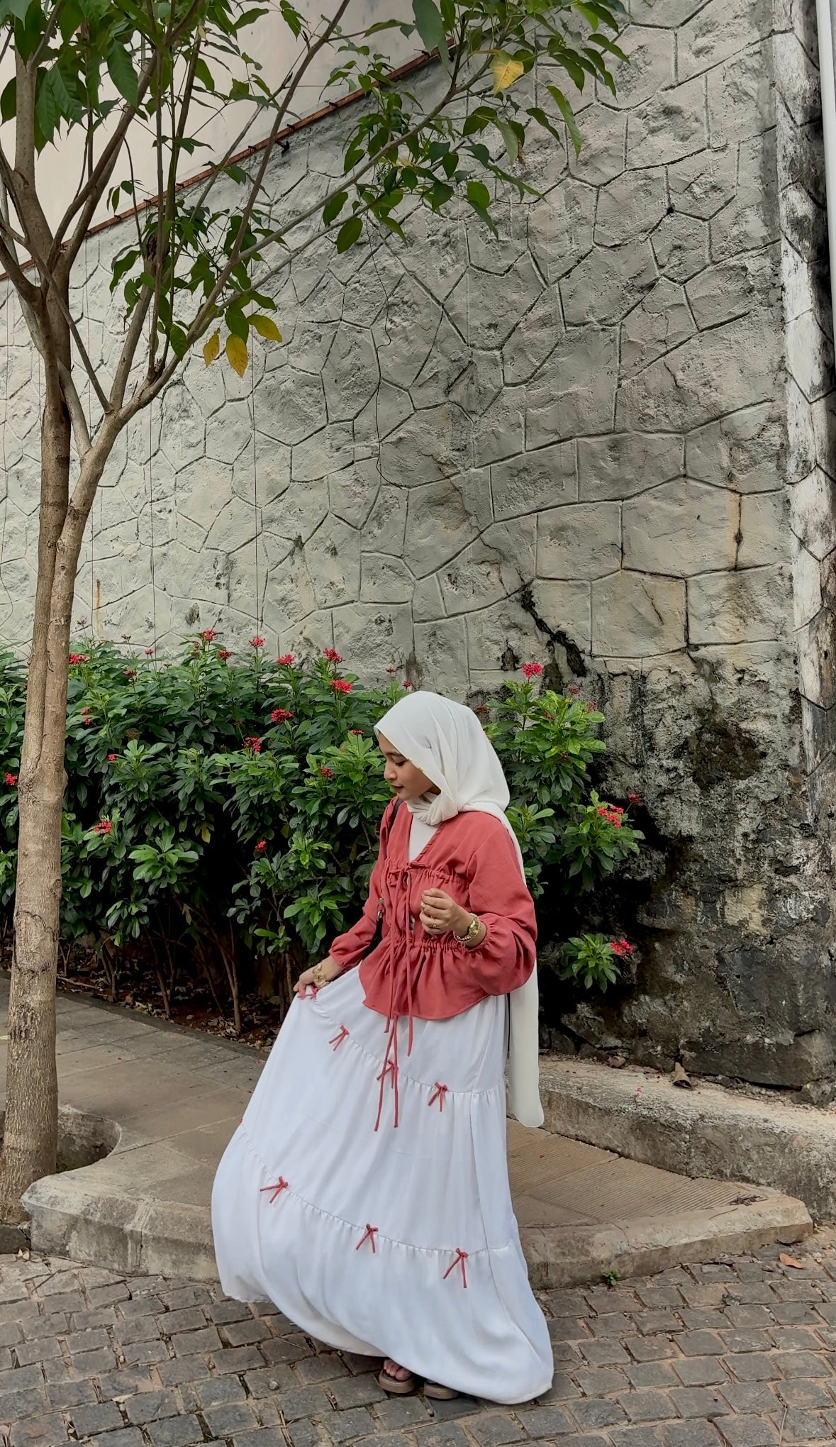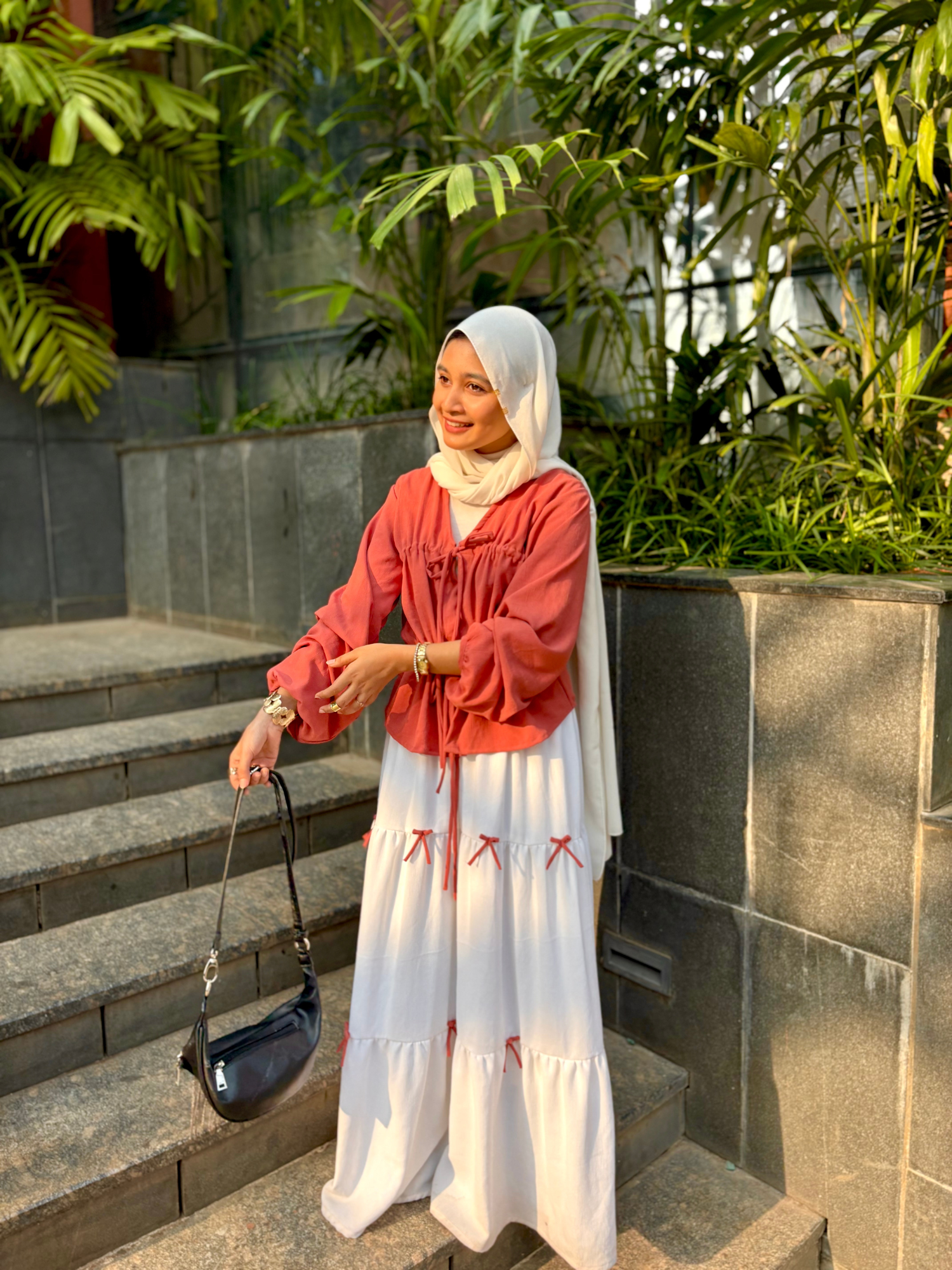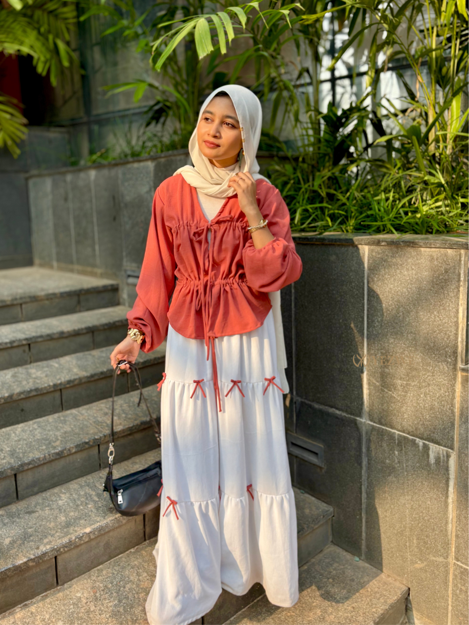 Embrace soft elegance with this rust drawstring top and white tiered maxi skirt set, designed for women who love modern modest wear with an effortless, feminine mood. The warm rust tone adds depth and richness, while the flowing white skirt brings balance, lightness, and everyday grace, making it ideal for Indian weather and versatile styling.