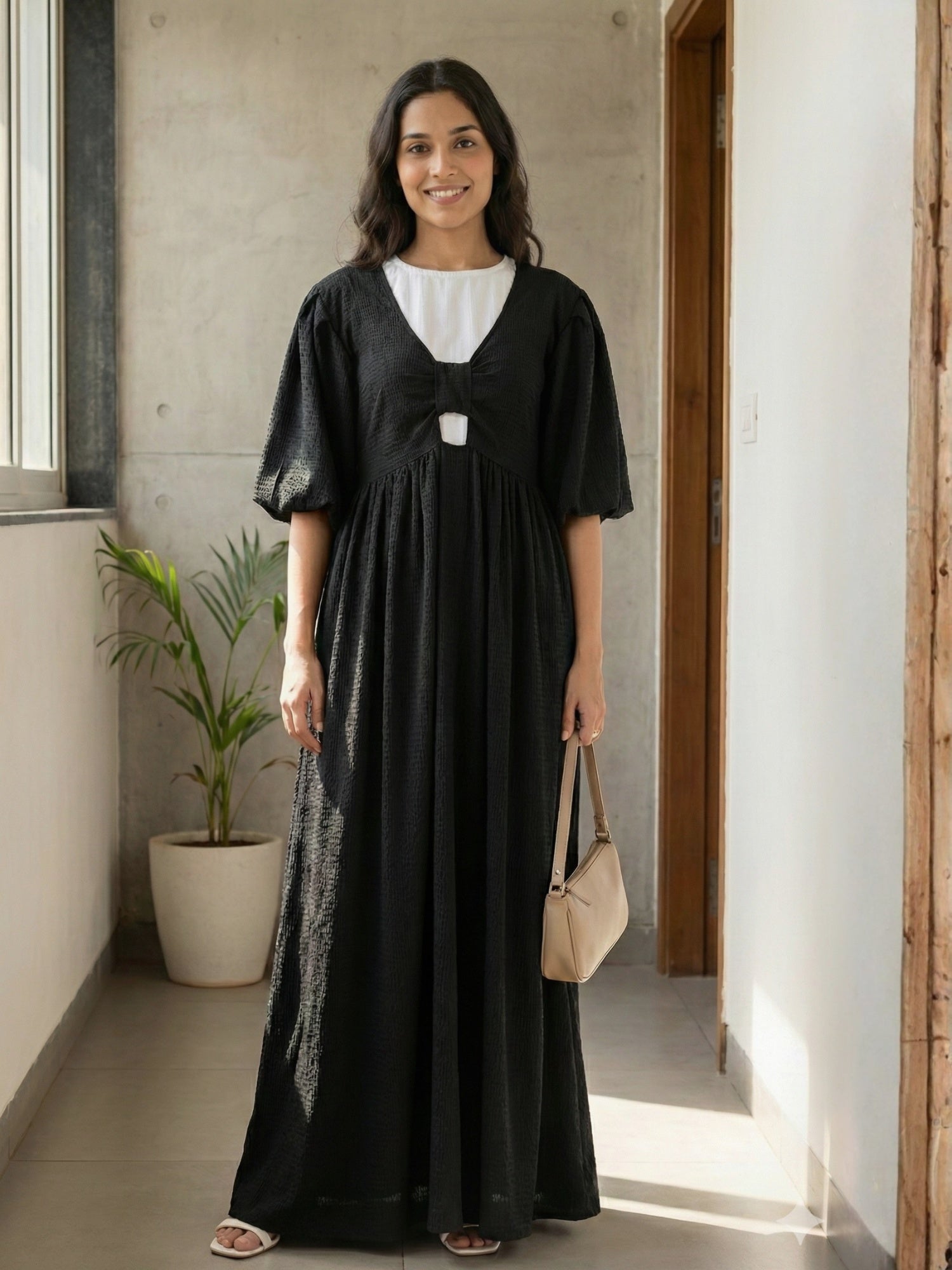 YEZWE Modest Maxi Dress in Black with Elegant Puff Sleeves and Fitted Waist Design
