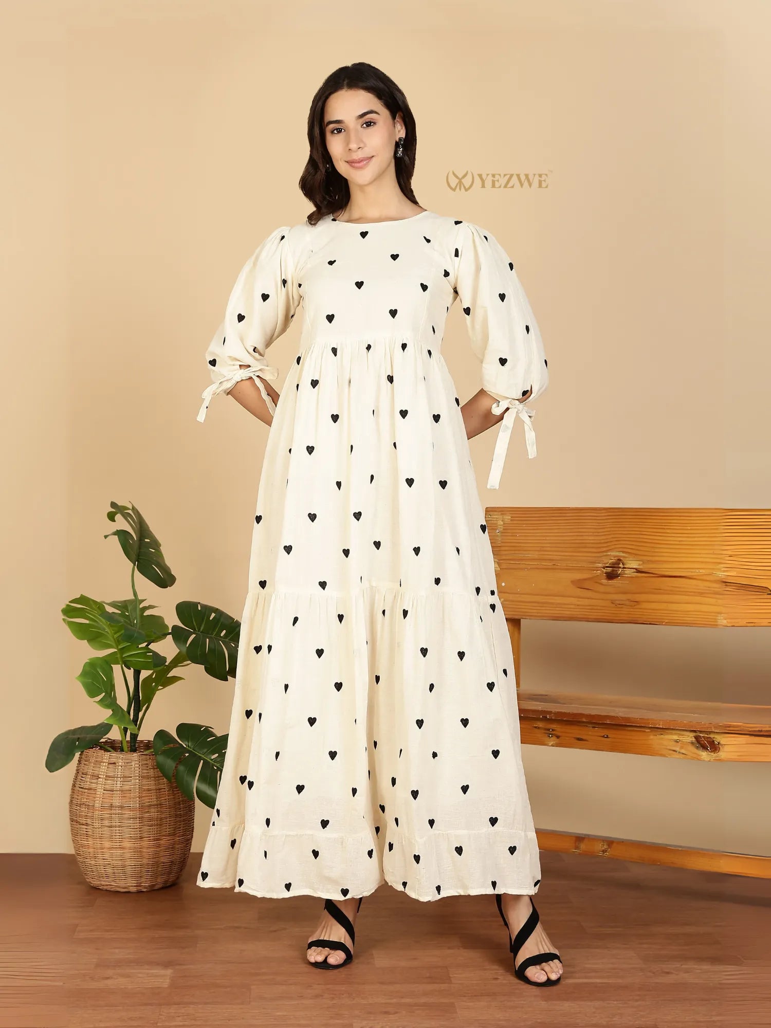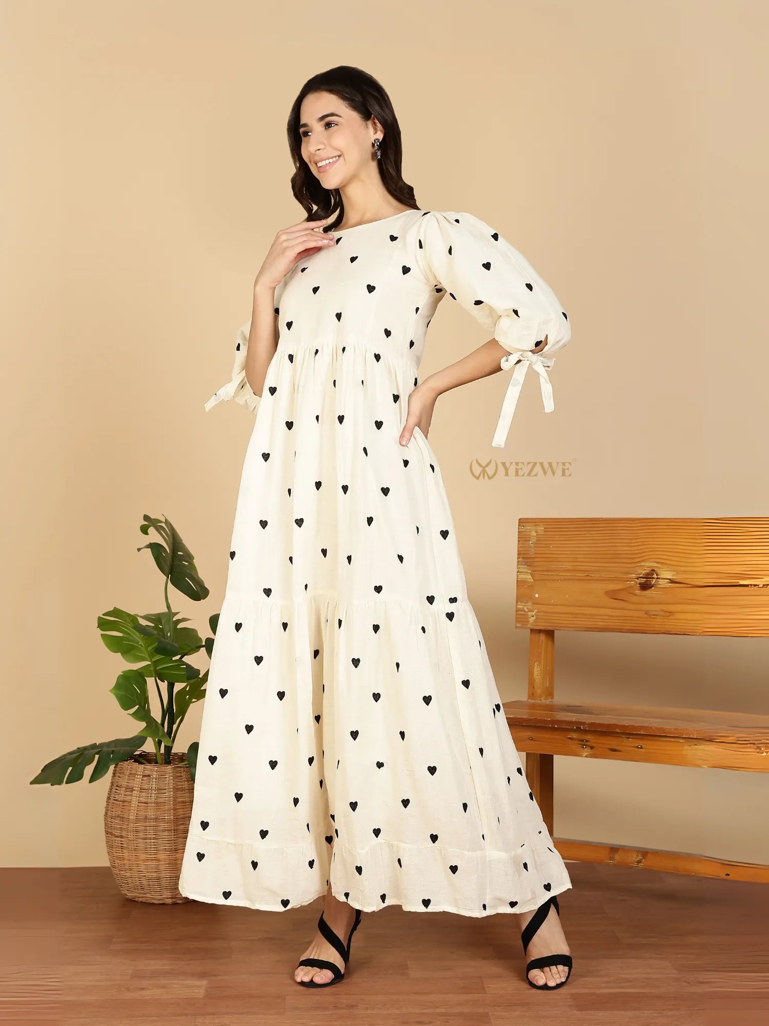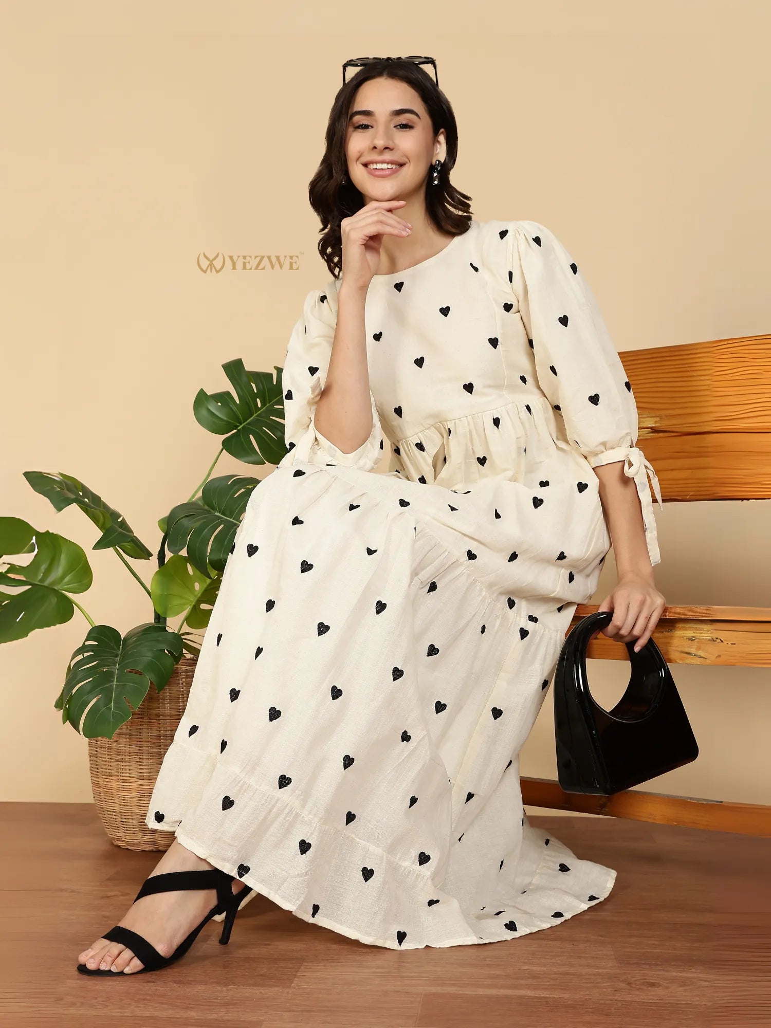 YEZWE Ivory Kora Cotton Modest Maxi Dress With Black Heart Embroidery
