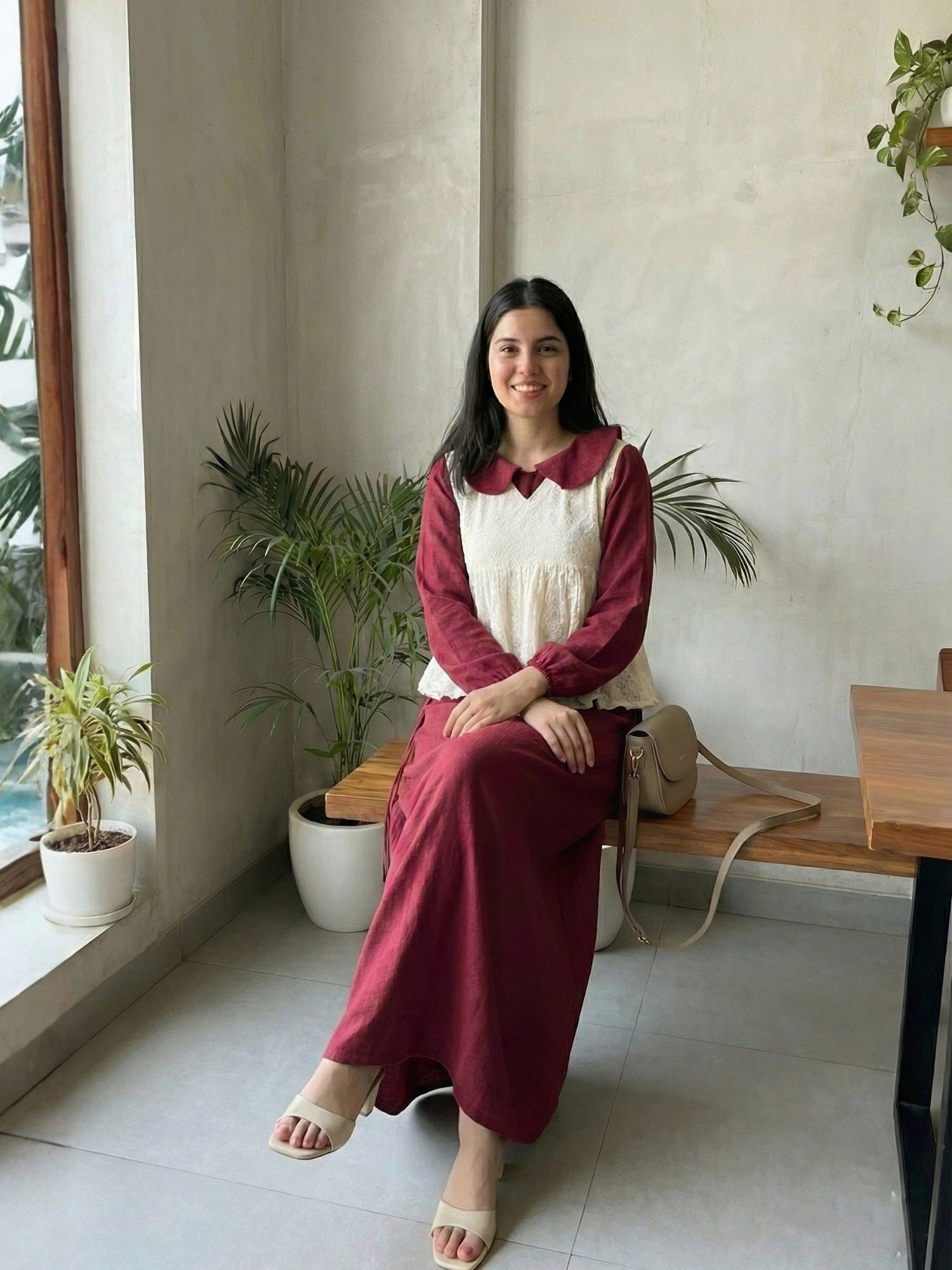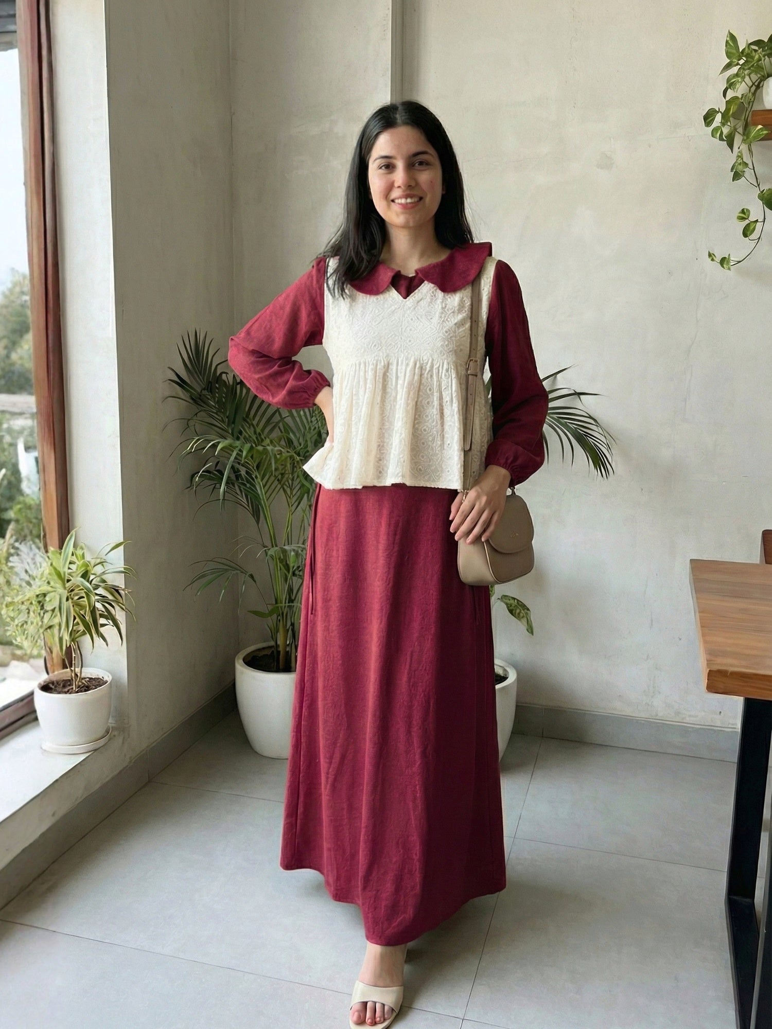 A timeless maroon silhouette that moves with ease and settles softly into everyday elegance.