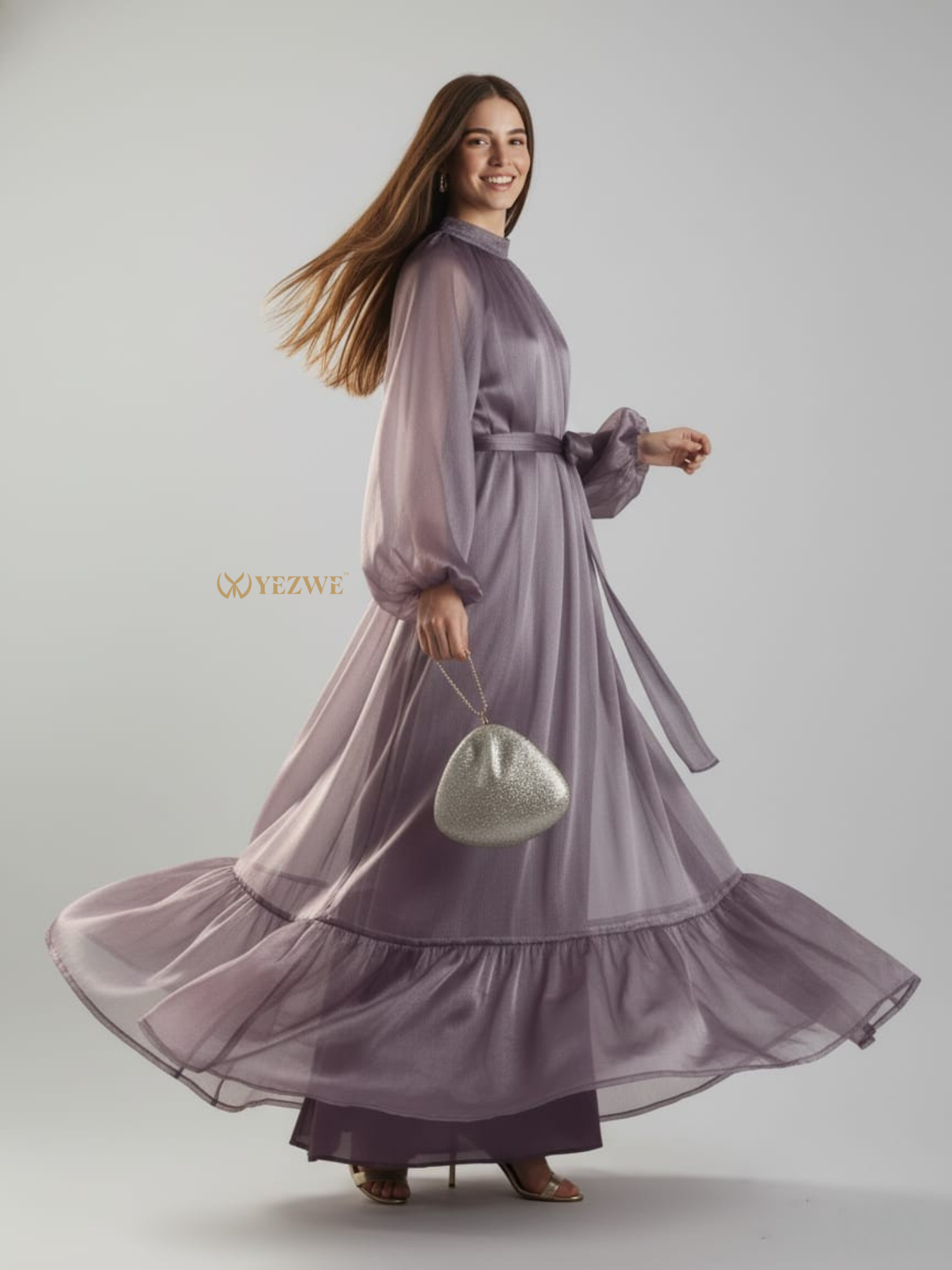 Soft, graceful, and endlessly elegant – the Yezwe Lavender Bloom Maxi Dress is made for women who want their evening wear to stand out without being loud. Designed in Kerala and tailored for global modest fashion lovers, this lavender high-neck gown is crafted from Avenger chinnon, a premium satin-viscose fabric with a weightless flow and luminous sheen. The ankle-to-floor length design comes with a ruched neckline, long bishop sleeves, and a flared tiered hem that adds volume without bulk.