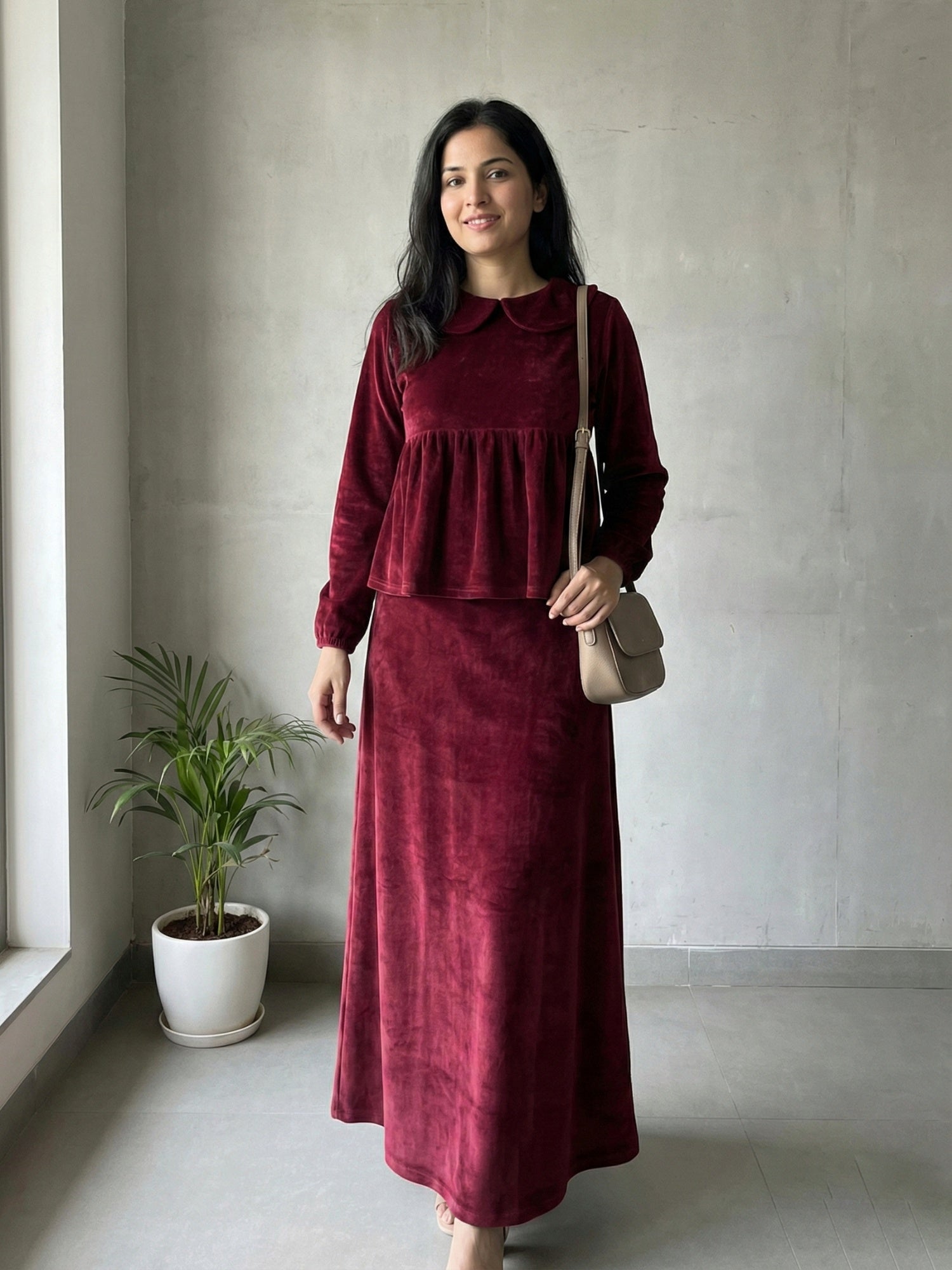 Velvet Skirt Modest Pinterest Top Set is a rich wine-toned co-ord designed for women who love elegant modest wear with a soft, romantic feel. Crafted for Indian weather and everyday grace, this set blends Pinterest-inspired styling with timeless comfort.