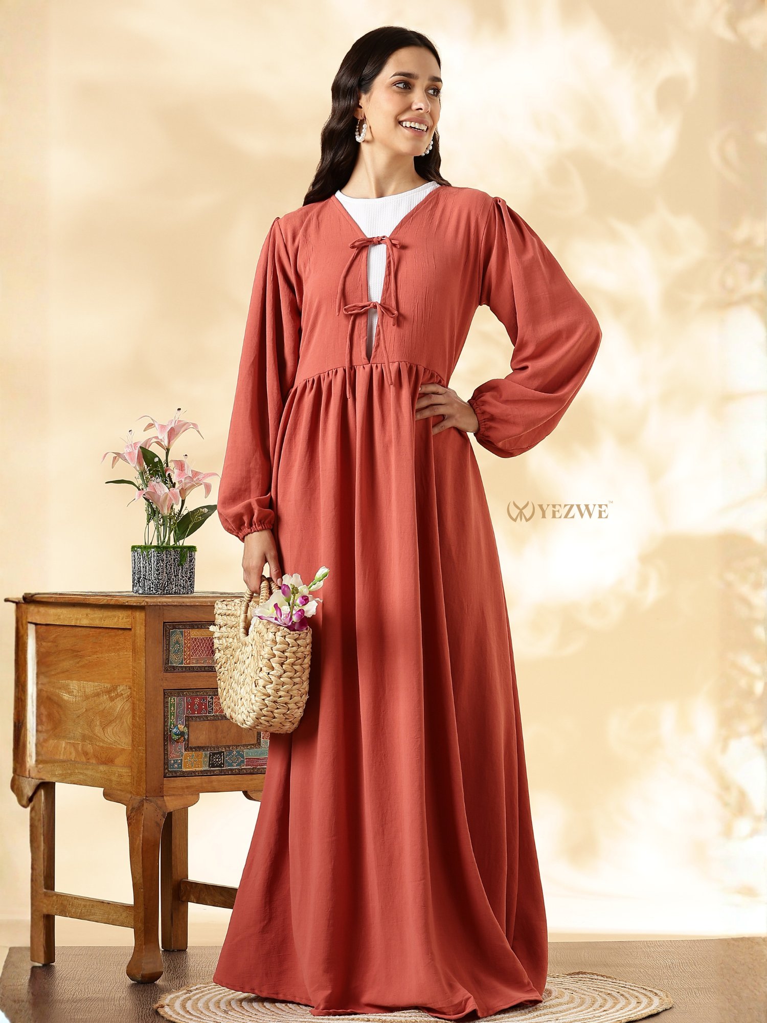 Designed for women who love effortless elegance, this maxi dress for women is crafted from a luxurious blend of knitted kar inner and soft cey outer fabric, offering both structure and fluidity. The full-length drape glides beautifully with your every move, while the tie-up neckline and bishop sleeves add a hint of playful sophistication.