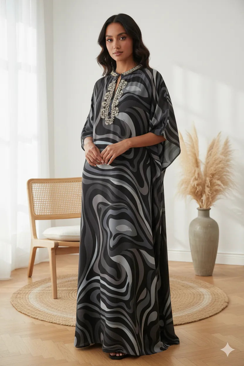 YEZWE Modest Wear Kaftan Dress with black and gray abstract patterns and embellished neckline
